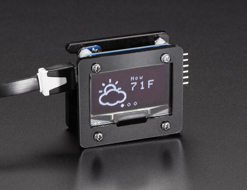 The Huzzah ESP8266 module is an inexpensive microcontroller with WiFi capabilities. It can be programmed with the Arduino IDE so that you don't need a separate microcontroller! This device gets the latest weather information from forecast.io and displays it on a 1.3" monochrome OLED display.