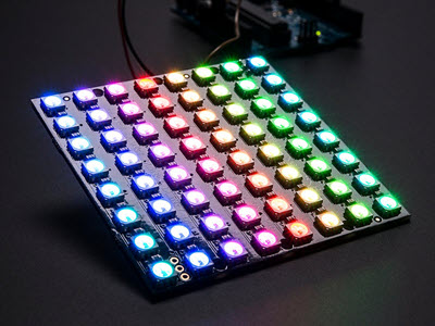 In this Visual Programming Visuino tutorial, we’ll use the Adafruit NeoPixel NeoMatrix 8x8 64 RGB LED Matrix to create random color running lights.