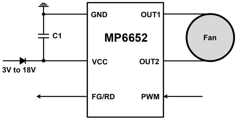 MPSのMP6652単相ブラシレスDCモータドライバには、パワーMOSFETとホール効果センサが統合されています。単相BLDCファンモータを3V~18Vの入力電圧(VIN)範囲で駆動します。
