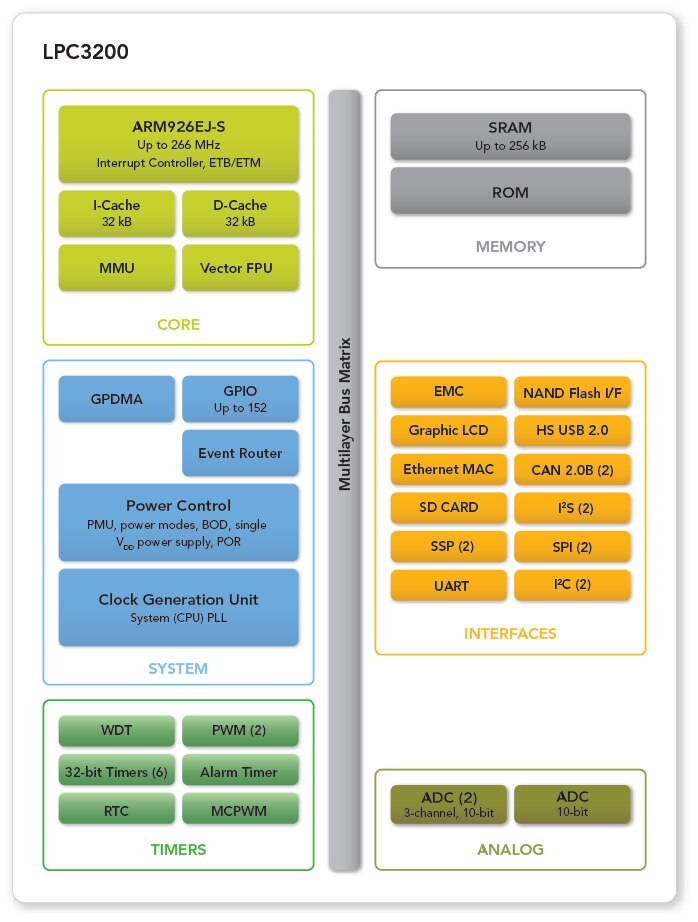 LPC3200 | 266 MHz | Up to 256 KB | DDR, SDR SDRAM and static devices | STN or TFT, up to 1024 x 768 | OTG, Host, Device | Linux | ARM926 |