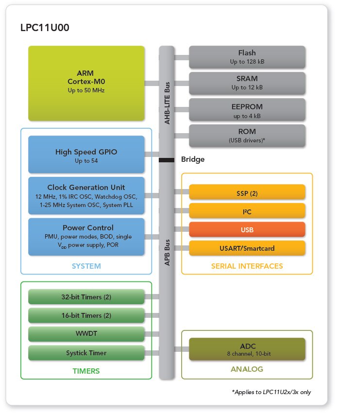 LPC11U00 | 50 MHz | 16 to 128 KB | 6 to 12 KB | Up to 4 KB | Cortex-M0 | • | 10-bit | HVQFN33, LQFP48, LQFP64 | |