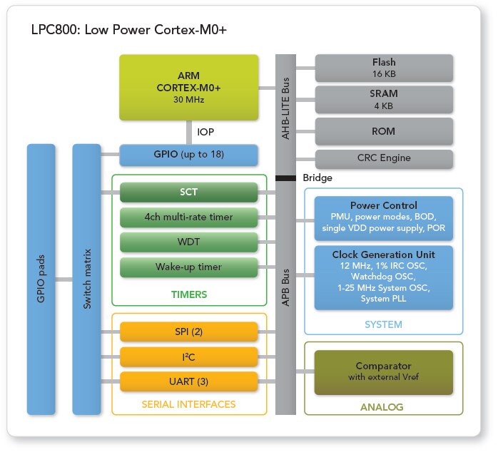 LPC800 | 30 MHz | Up to 16 KB | Up to 8 KB | Cortex-M0+ | Comparator | DIP8, SO20, TSSOP16, TSSOP20 | |