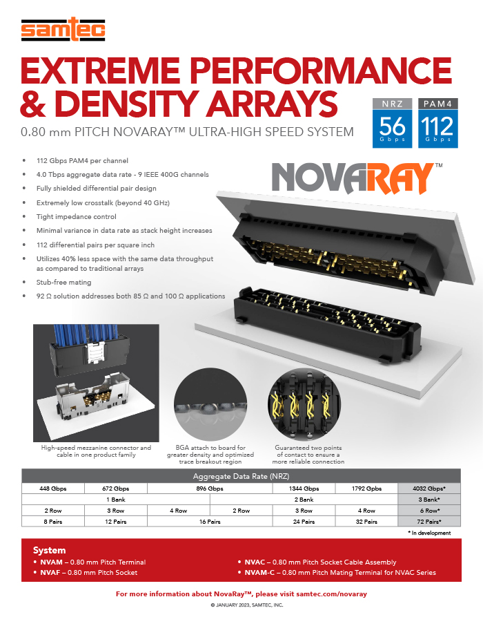 56Gbps NRZ(Non-Return-to-Zero)は、デジタル論理信号の1/0情報を表現するために、信号レベルの低さと高さを利用した2値コードです。NRZは、信号シンボル周期ごとに1ビット、つまり0または1の情報しか送信できません。NRZの目的は、同軸、ファイバ、またはPCBトレースを介してデータのバイトを送信することです。NRZ信号は、サンプリングされた信号の帯域幅であるナイキスト周波数が高く、信号のサンプリング周波数の半分に相当します。SamtecのNovaRay®やAcceleRate® HP Arrayなどのコネクタシステムは、56Gpbs NRZが可能で、高速アプリケーションに適しています。
