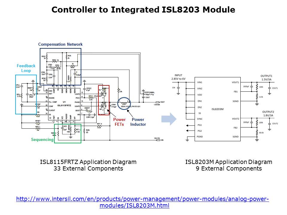 Renesas has integrated the essential external components into an equivalent power module. These components include the switching power FETS, power inductor, switching frequency and compensation network components, which include the feedback loop as shown in the ISL8115FTR controller application diagram.