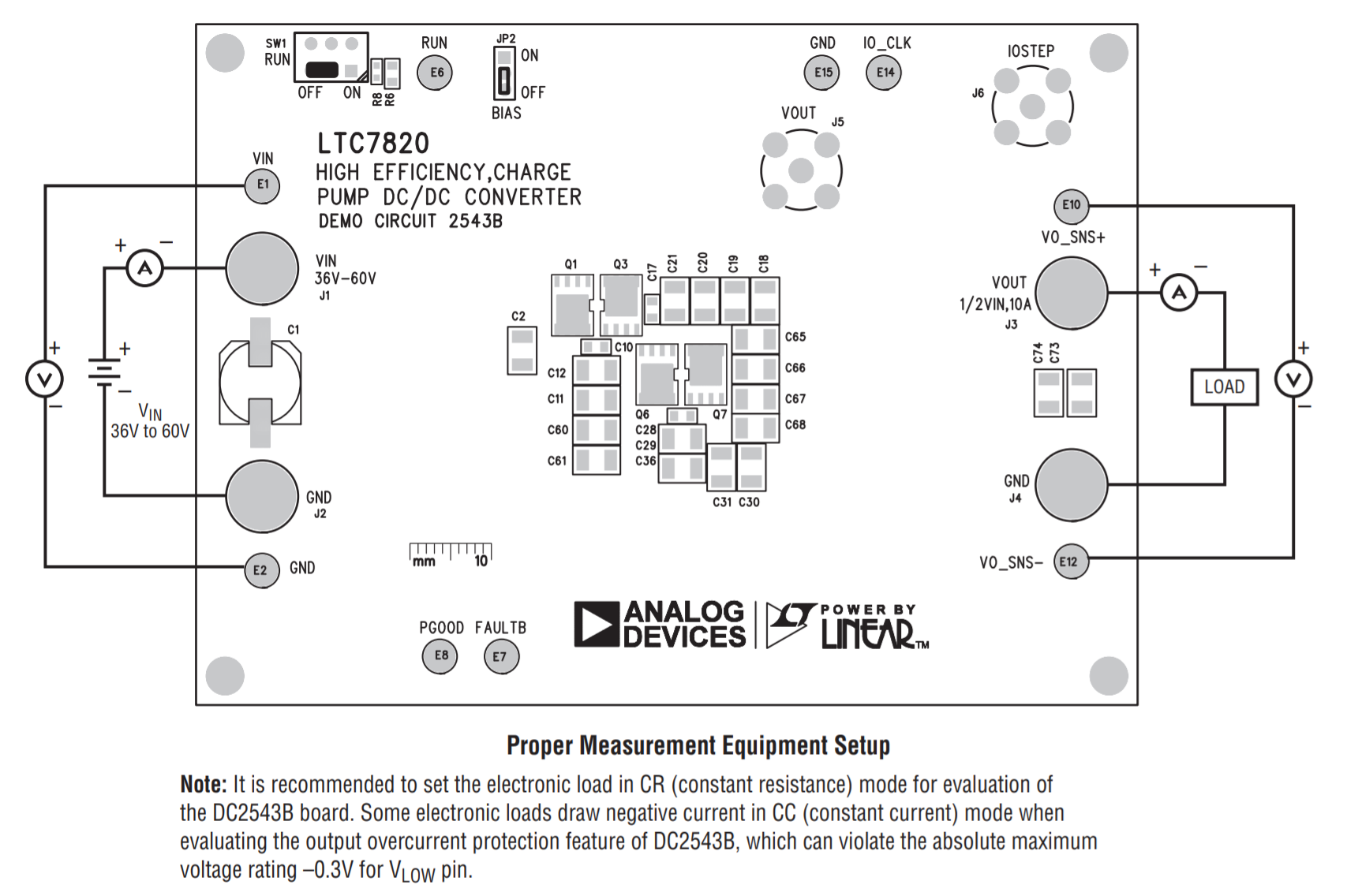 The DC2543B needs to be powered on with no load current or a very small load current (less than 50mA) with the default setup. Large load current can be applied after VO is established. The board offers a disconnect FET option which is controlled by the LTC7820 FAULT pin to disconnect the load during startup as shown in the schematic. Please refer to “Voltage Divider Prebalance Before Switching” section in the LTC7820 data sheet for more details regarding the startup of the voltage divider. The board also features some protection functions such as overcurrent and thermal shutdown to make it a reliable solution.