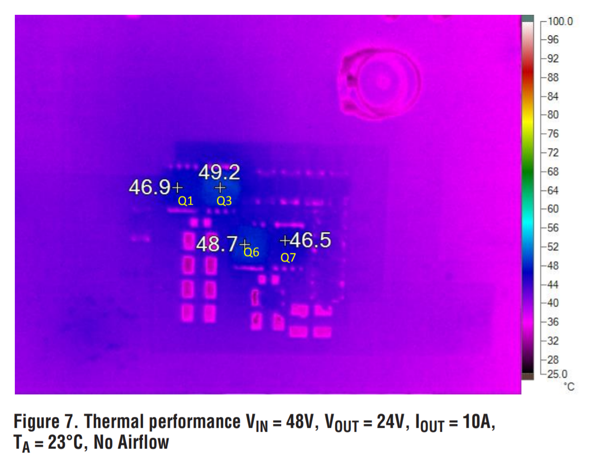 The DC2543B provides a very high efficiency solution of 98.7% when converting 48VIN to 24VOUT at 10A. When configured for a 20A output, an efficiency of up to 98.4% is achievable for a 48VIN to 24VOUT at 20A.