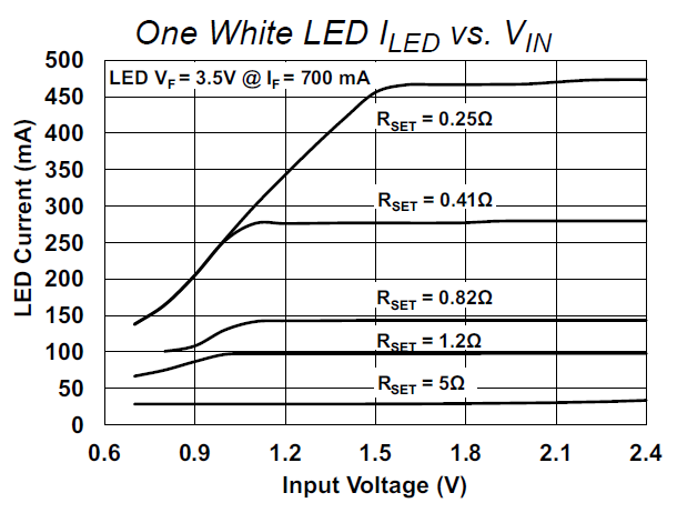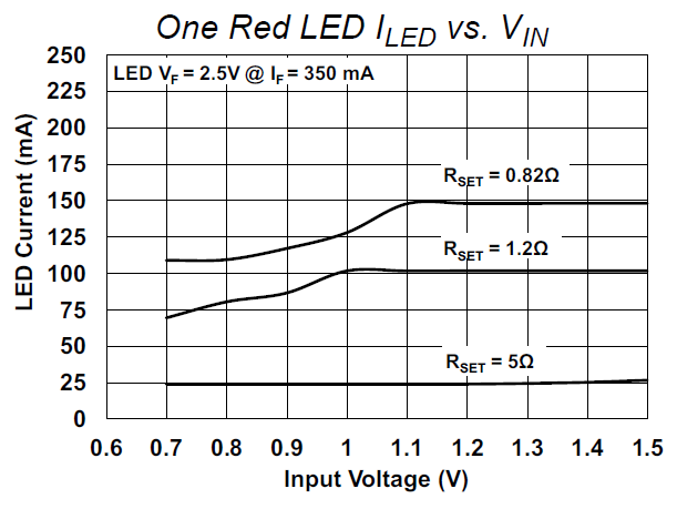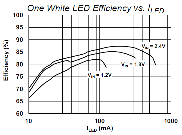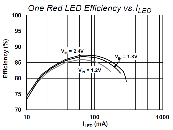 >85%, 1.8V in, 33 ~ 160 mA (1 RED LED) >85%, 1.2V in, 38 ~ 110 mA (1 RED LED) >80%, 2.4V in, 21 ~ 600 mA (1 WHT LED) >80%, 1.8V in, 22 ~ 320 mA (1 WHT LED) >80%, 1.2V in, 50 ~ 120 mA (1 WHT LED) |